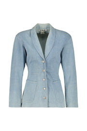 Ribbed denim jacket, shawl collar, single breasted with effect, two patch pockets, long sleeves. White label, navy graphics.
