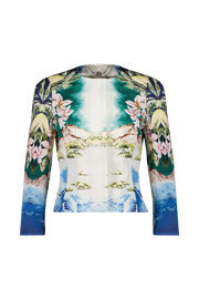 Jacket in satin cotton printed with a multicolored island pattern on a white background, round neckline, single breasted buttoning, 3/4 sleeves, side slits.
